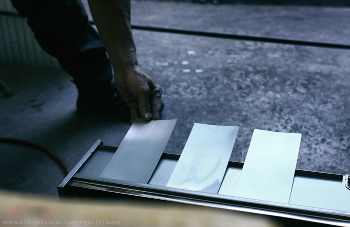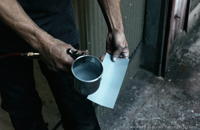 僕のイメージの中にある2色のメタリック色を、実際に調色して色見本をつくり、今後様々な塗料や塗装方法でこの色を再現できるようにするための調色データや塗装回数、塗装方法などを細かく決定していくとても大切な工程です。