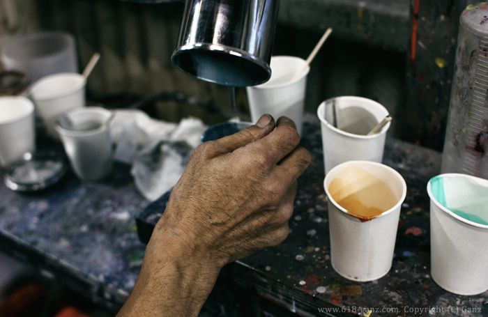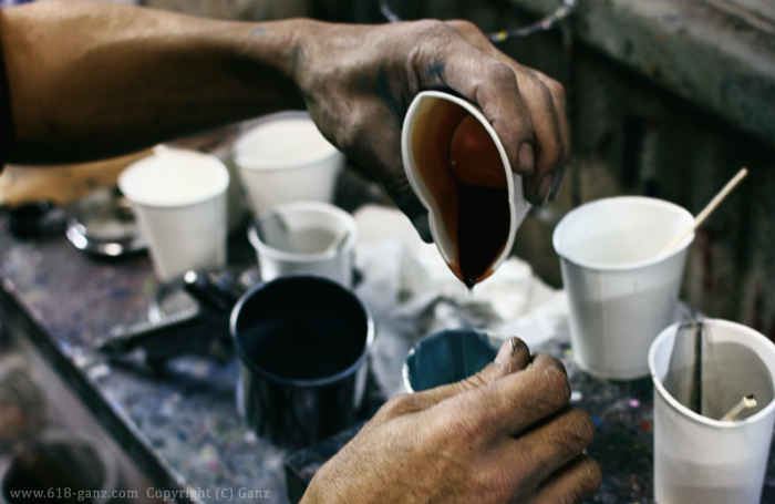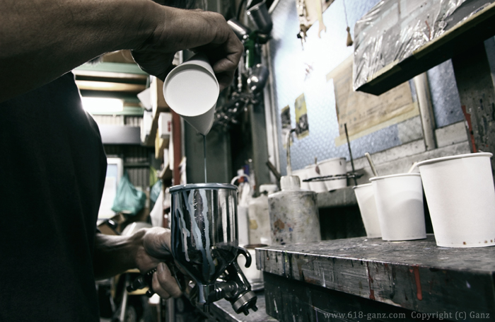 普段自分で行っているソリッドカラーの調色と違って、メタリック色の調色には独特のノウハウが必要だと思っています。そこで技量も材料も豊富で僕の好みを理解して熱心に追求していただける先輩にお願いしたのです。