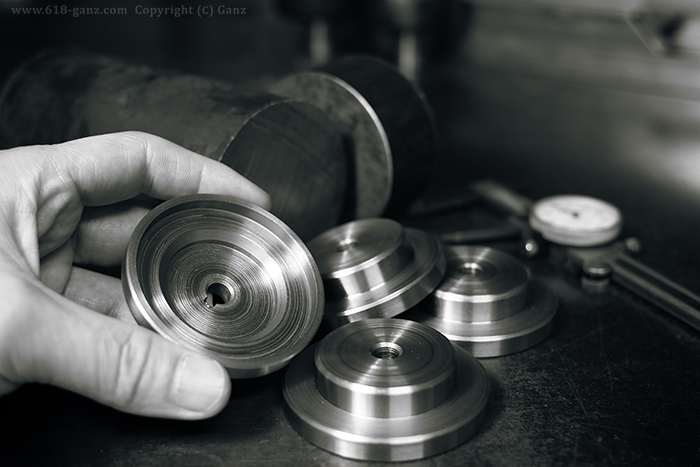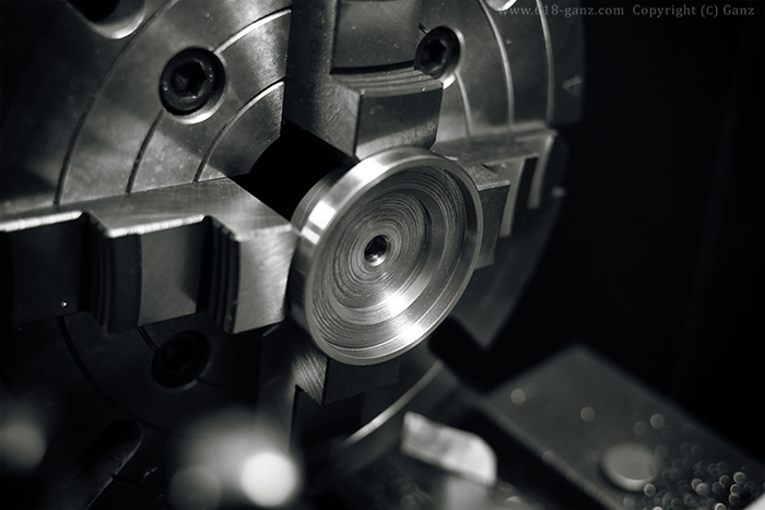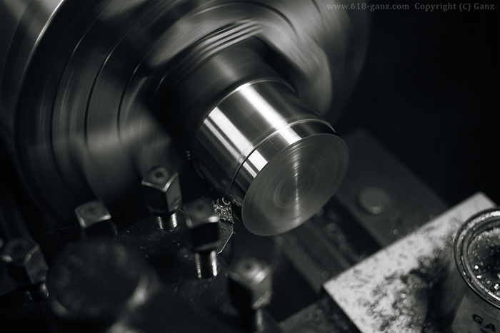 まずは旋盤に鉄の丸棒をセットしてアイアンシェードの左右のエンド部分を加工していきます。