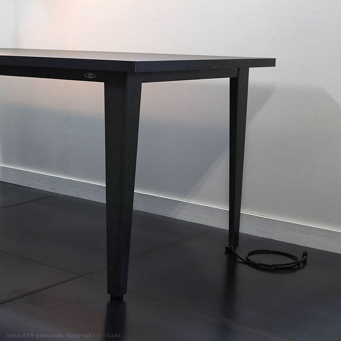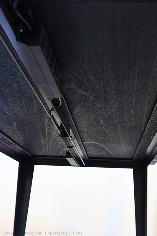 パソコンからタップまでのケーブル類は ベルクロやタイラップ(結束バンド)で手軽にスッキリまとめられる仕様にしています。企画当初は 天板へ穴を開ける案もありましたが将来的な使用環境の変化や、作業スペースの確保、レイアウトの自由度から今回の仕様に決定しました。