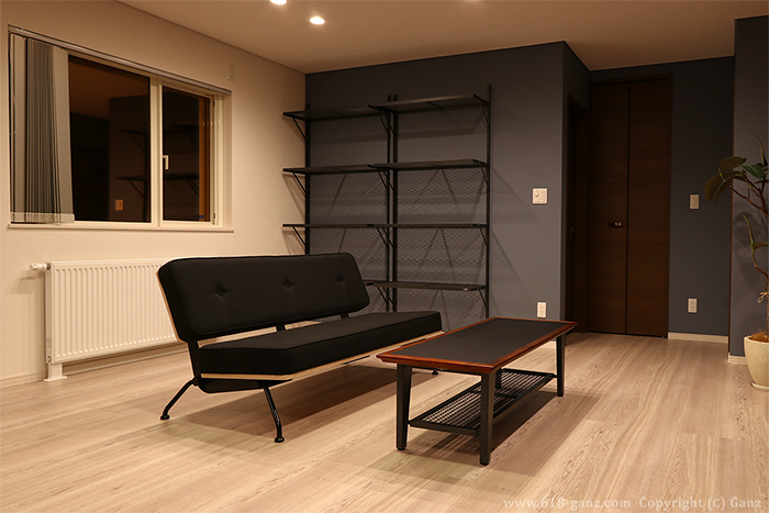 続いてのポイントは フローティングレイアウトのアイアンメッシュシェルフです。