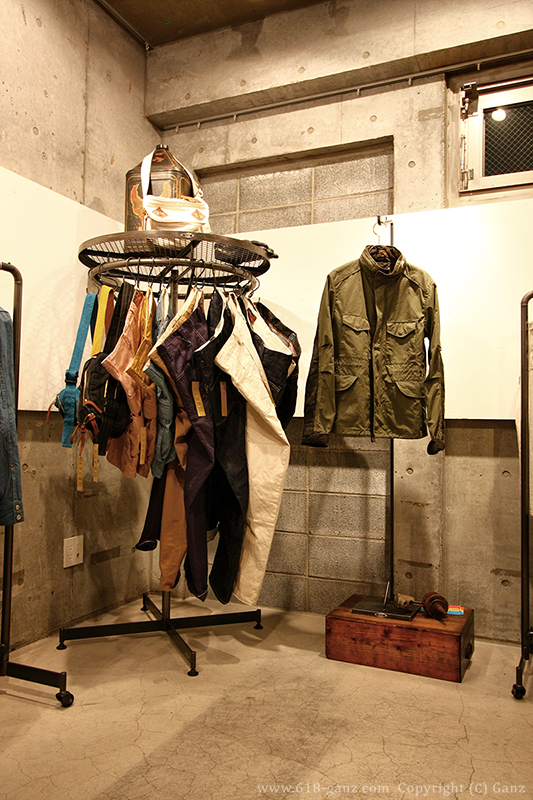 こちらもS字フックを使用して、バッグやパンツをディスプレイしています。ベルトループを活用して「たたみ」では難しいディティールのアピールができますね。フックを活用することで什器としての機能がグッとアップしたかのようにディスプレイの幅が広がります。