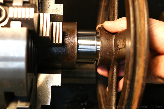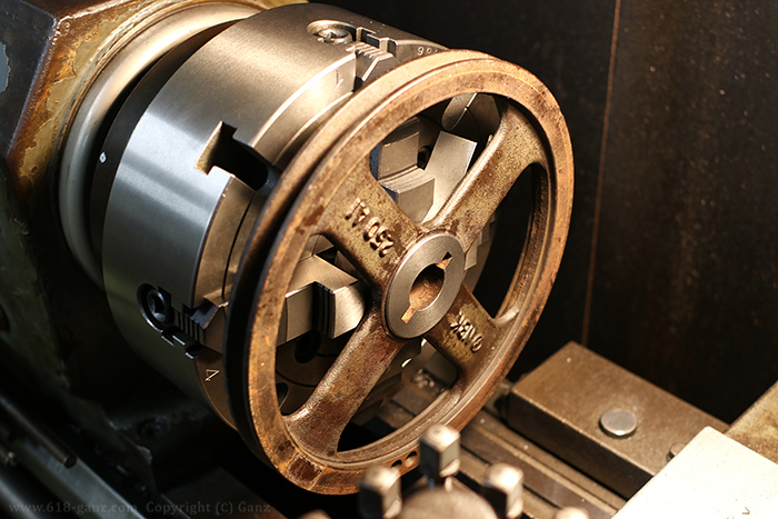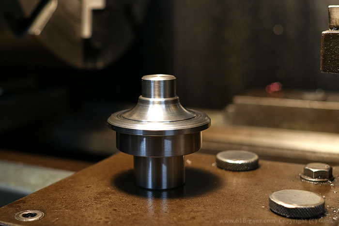 プーリーの中央の軸穴部分に支柱を取り付けるため、見た目も良く機能的な「センターボス」を鉄の塊から削り出して製作します。