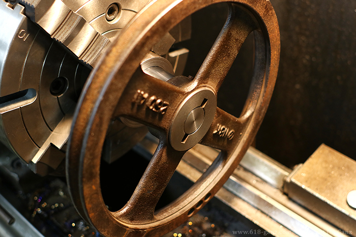 床に接する面の中央部分が少し飛び出ていて邪魔なので、旋盤にセットして削っていきます。