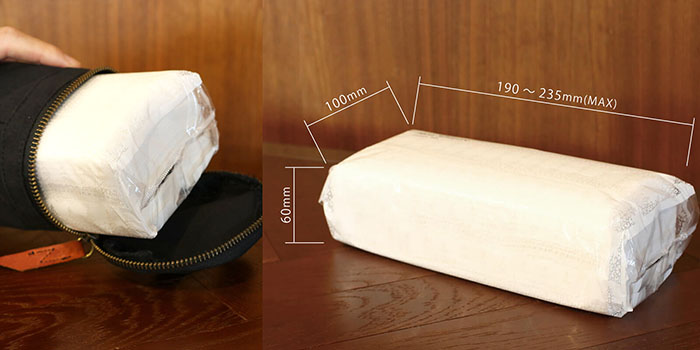 ※ ボックスティッシュの中身を出して使用する場合は、取り出したティッシュをビニール等の袋に入れて、取出し部分に十分な長さの取出し口を設けてからケースに入れていただくと、ストレスなくご使用いただけます。