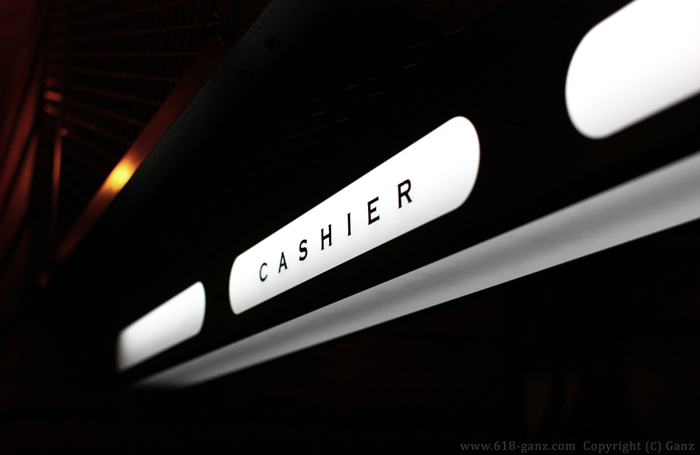 レジカウンター頭上に設置するメッシュシェルフと「CASHIER」ランプボックスサインを製作させていた