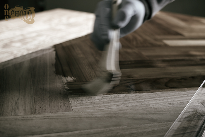 続いてのサンプルは 木材へのロゴ入れです。 ベースカラーペイント ロゴ入れ後 軽くエイ