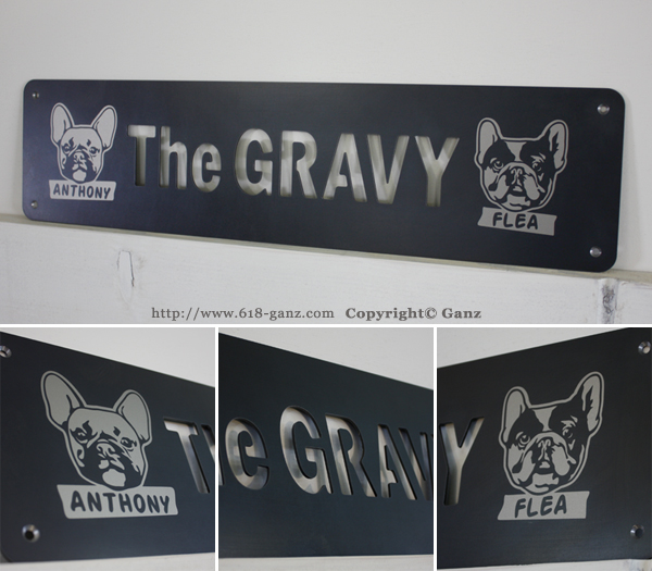 鉄板にフレンチブルドッグのイラストとショップ名をレーザー加工したアイアンサイン いつも