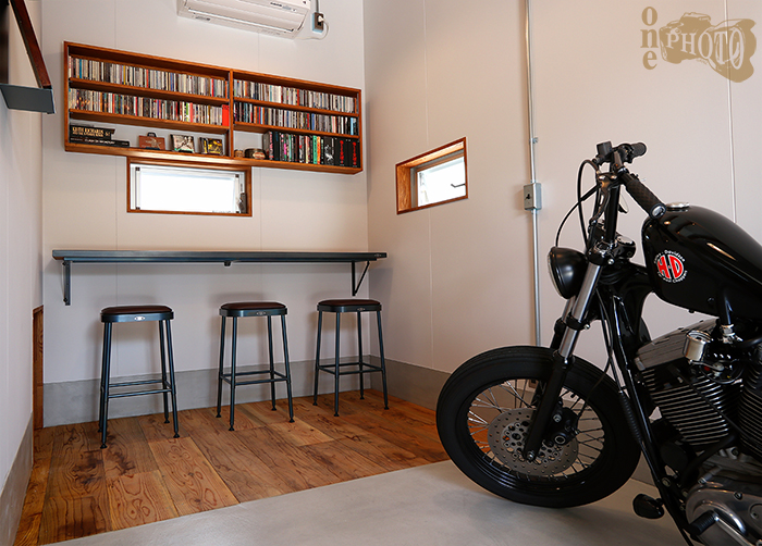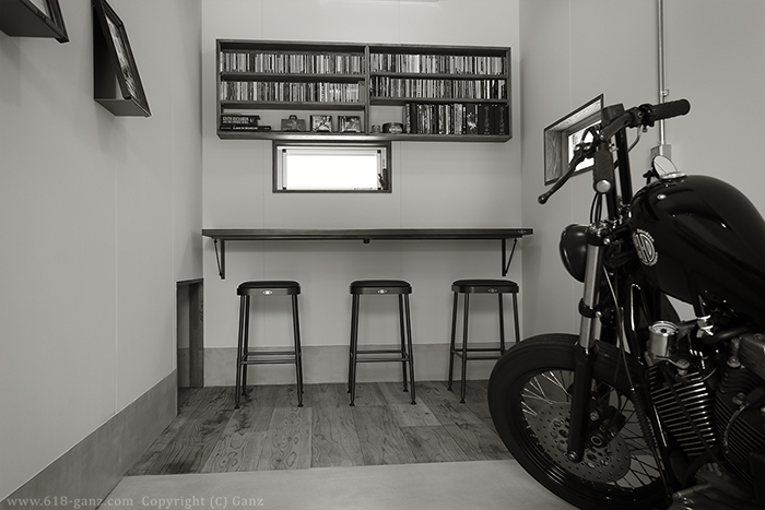 スポーツスター(ハーレー)のチョッパーに乗るオーナーさんからご相談いただき、ガレージにチーク材のカ
