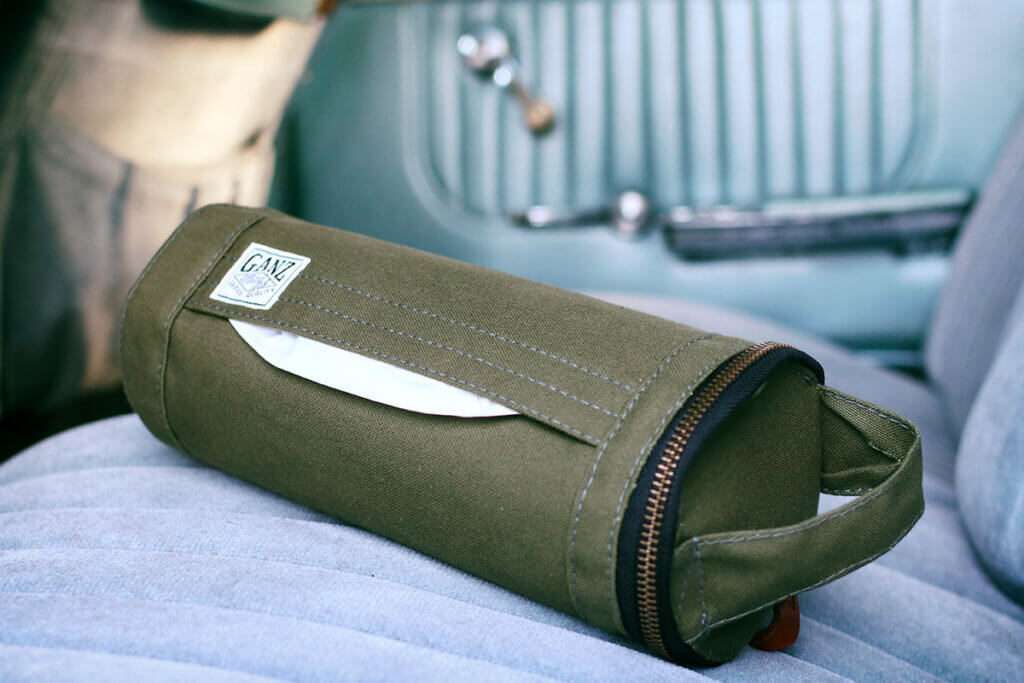 新作のティッシュケースについて スタイリッシュな円筒形のデザインを、高密度で張りのあるダック生地を用いて具現化したティッシュケースです。 ダック生地ならではの絶妙なカラーと、使用にともなうエイジングによって、お気に入りの