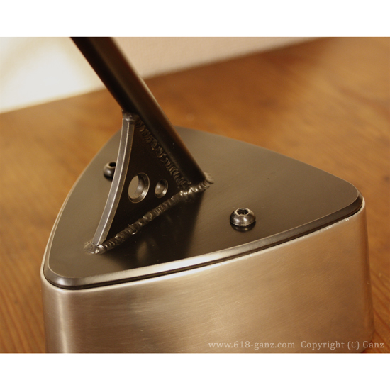アルミシェードの形状からデザインし、黒皮鉄とアルミのコントラストを生かして制作しました。