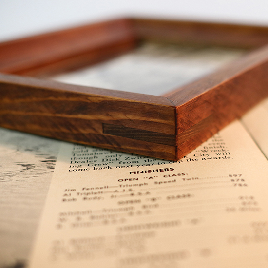ウッドフレームは天然木の木目や節といった個性を生かしつつ、クラシカルなモールディングと着色で味付けしています。